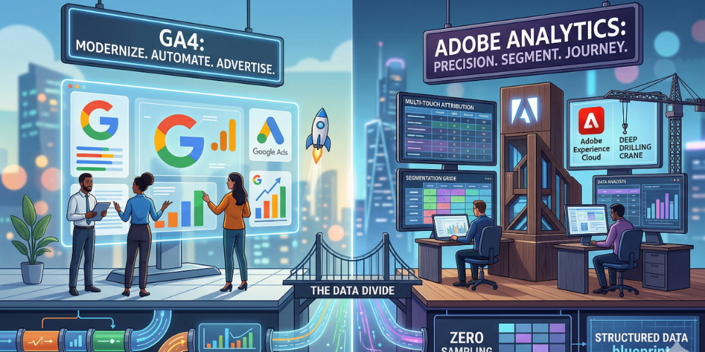 - Adobe is "measure twice, cut once." Nothing is tracked unless you define it (eVars, props, and success events). It takes months to set up, but the data is "cleaner" because it was built with a specific business blueprint.