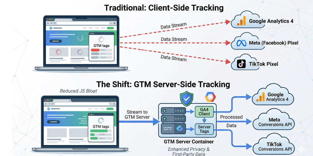 Traditionally, GTM operates on the client-side (the user's browser). When a user clicks a button, the browser executes multiple JavaScript tags, sending data directly to vendors like Google Analytics, Facebook, or TikTok.
